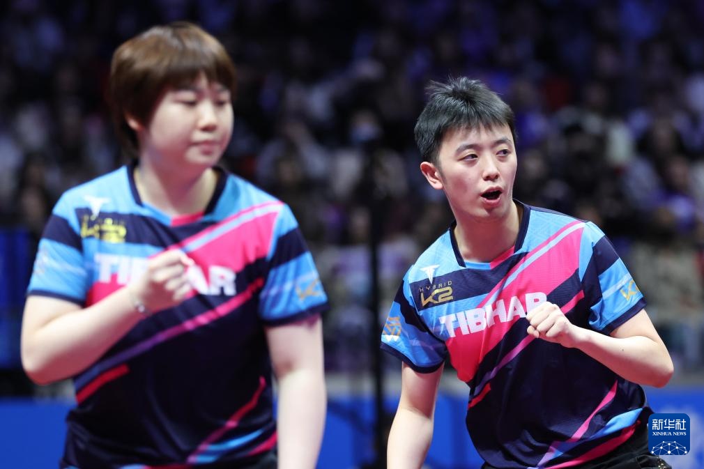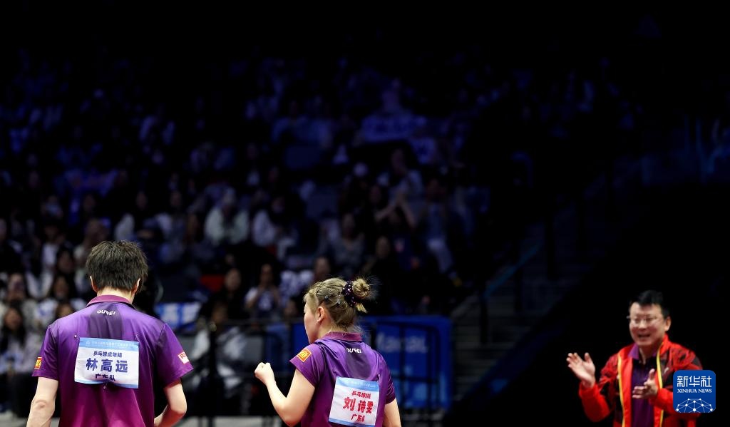 11月14日,廣東隊組合林高遠/劉詩雯(右)在比賽中回球。