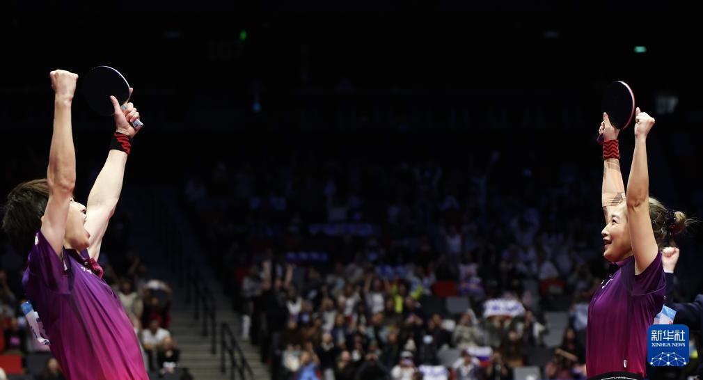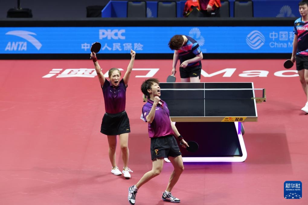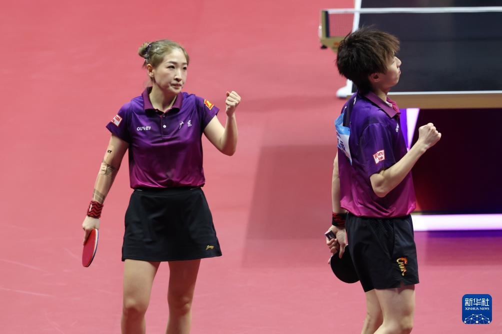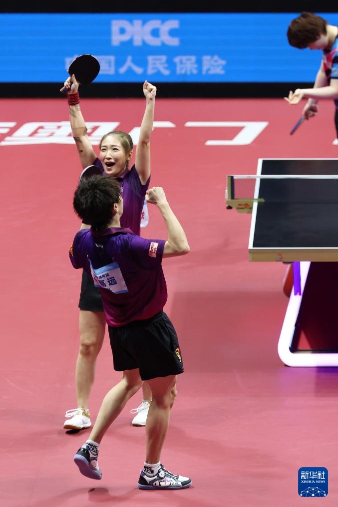 11月14日,江蘇隊組合陳垣宇(右)/蒯曼在比賽中慶祝得分。