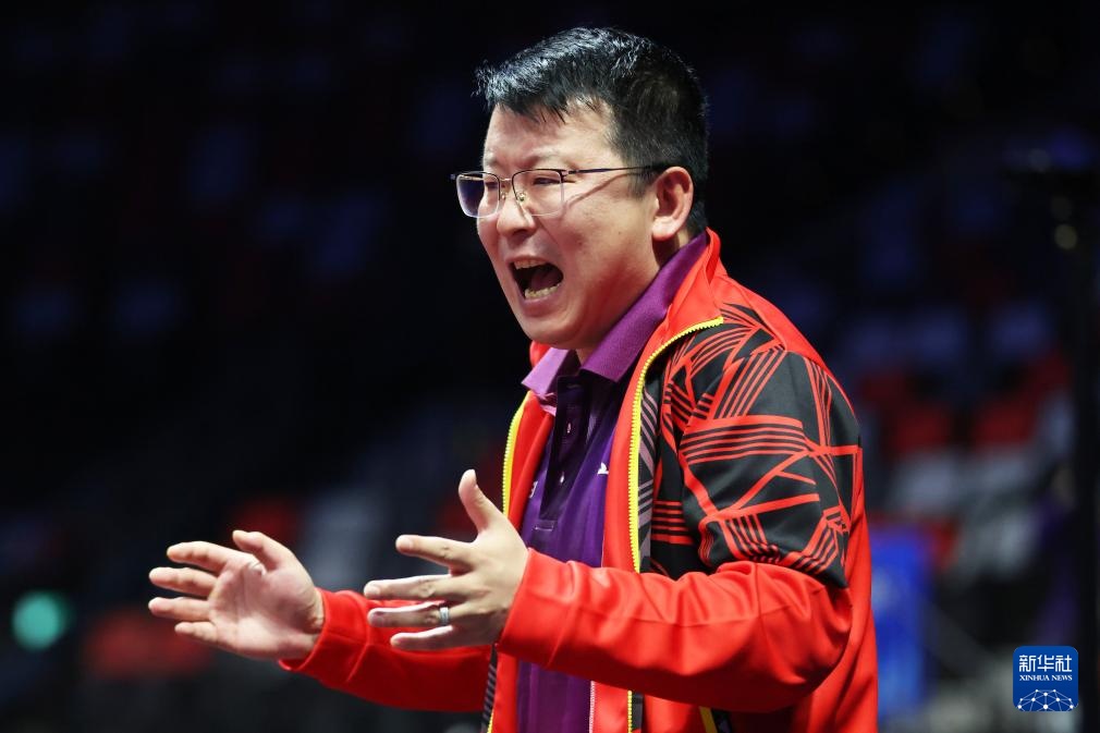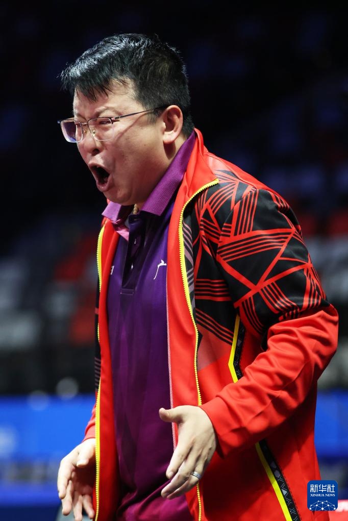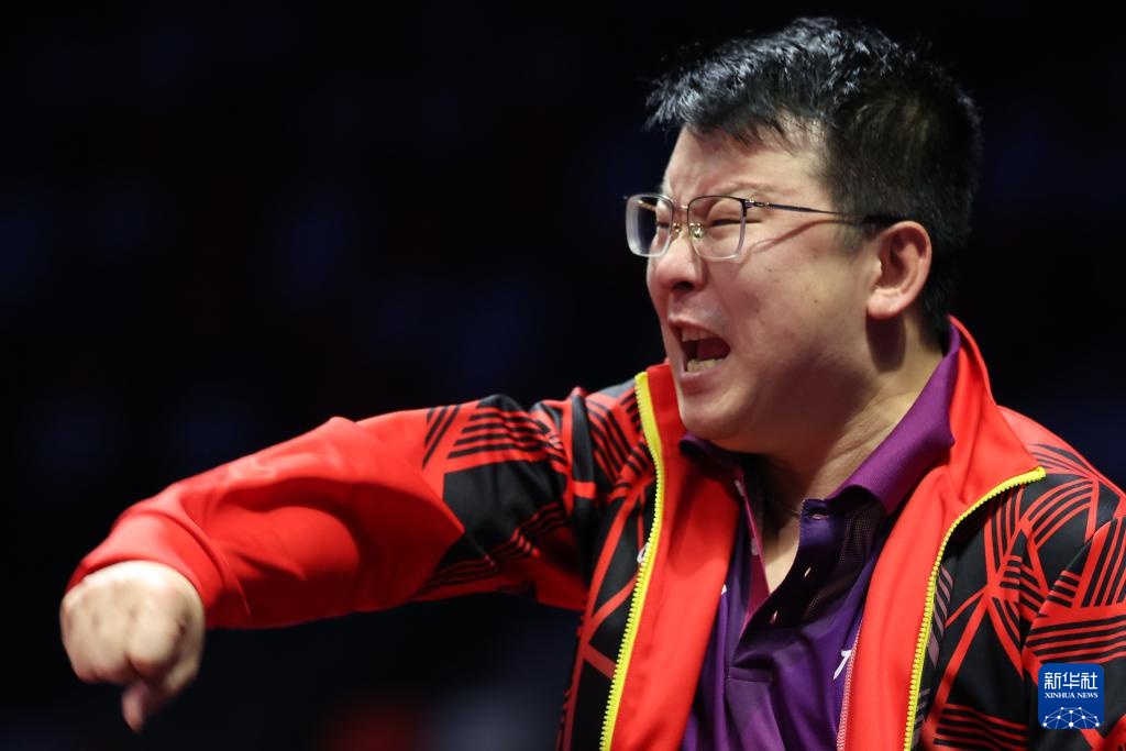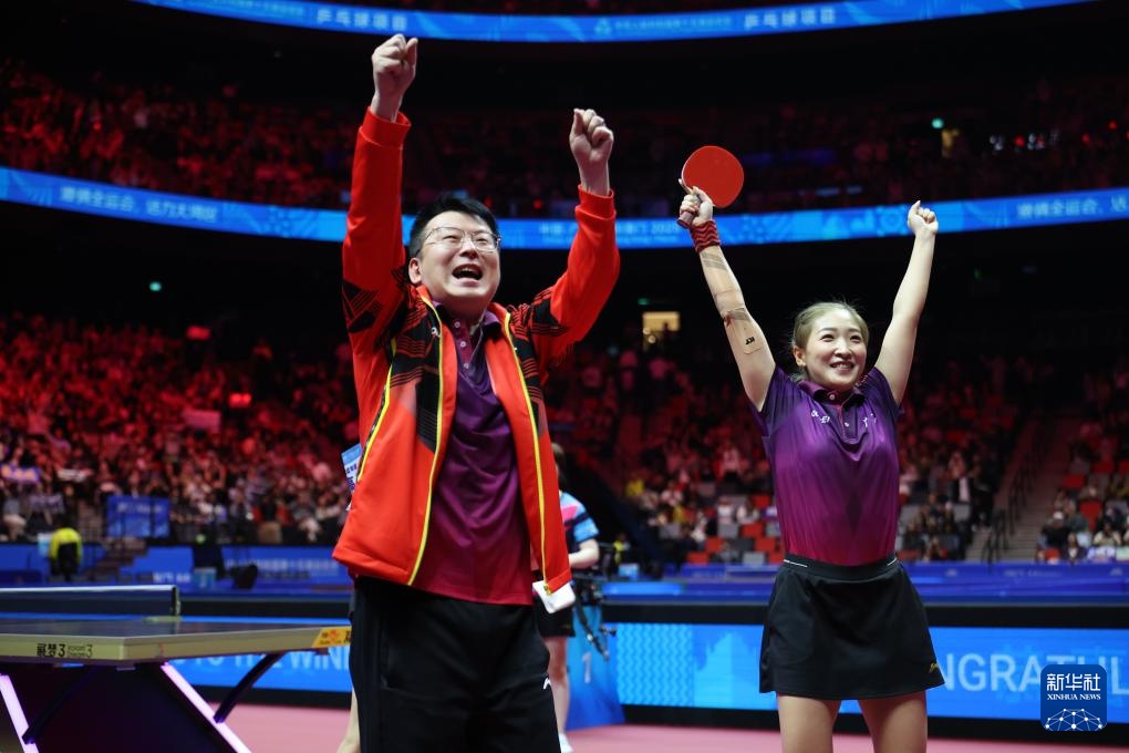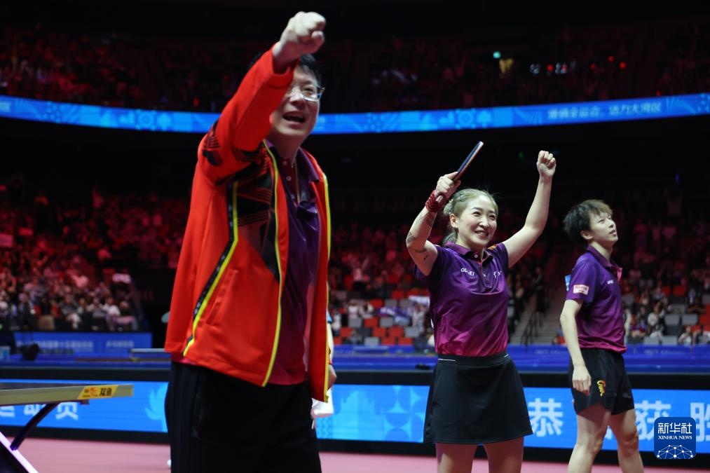 11月14日,廣東隊組合林高遠(右)/劉詩雯(中)與教練張超在比賽后慶祝奪冠。