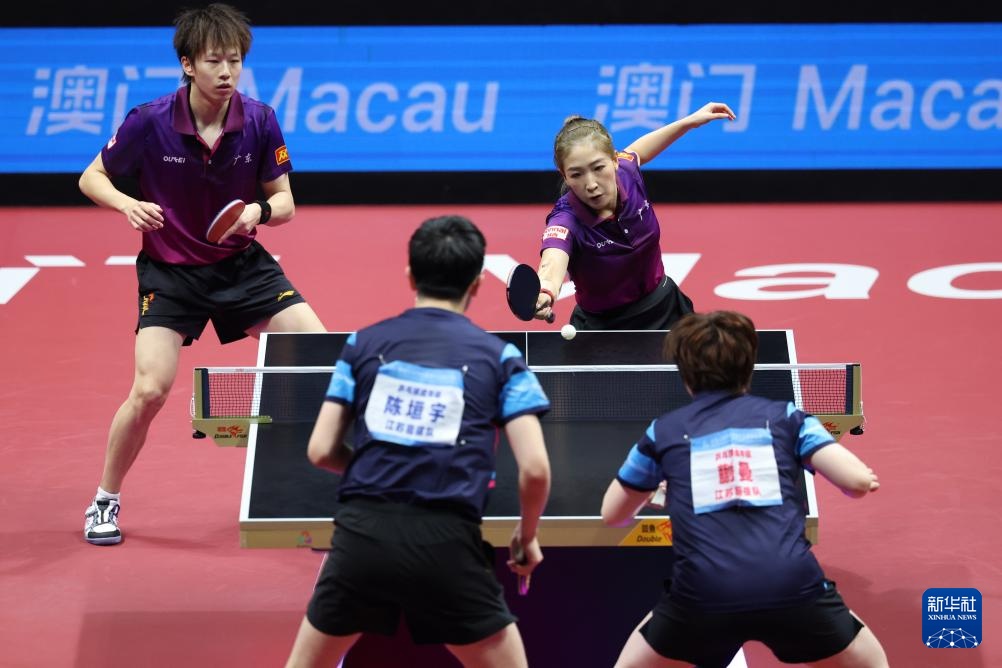 11月14日,江蘇隊組合陳垣宇/蒯曼(左)在比賽中回球。