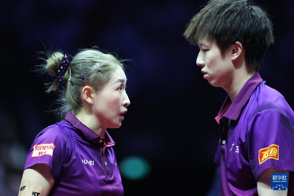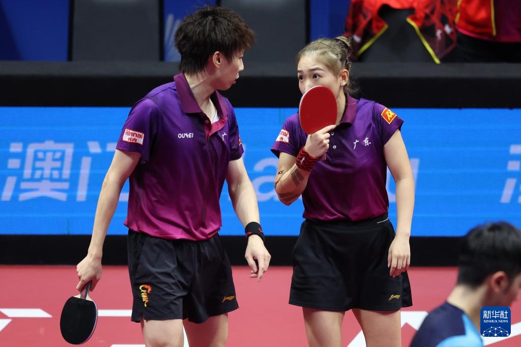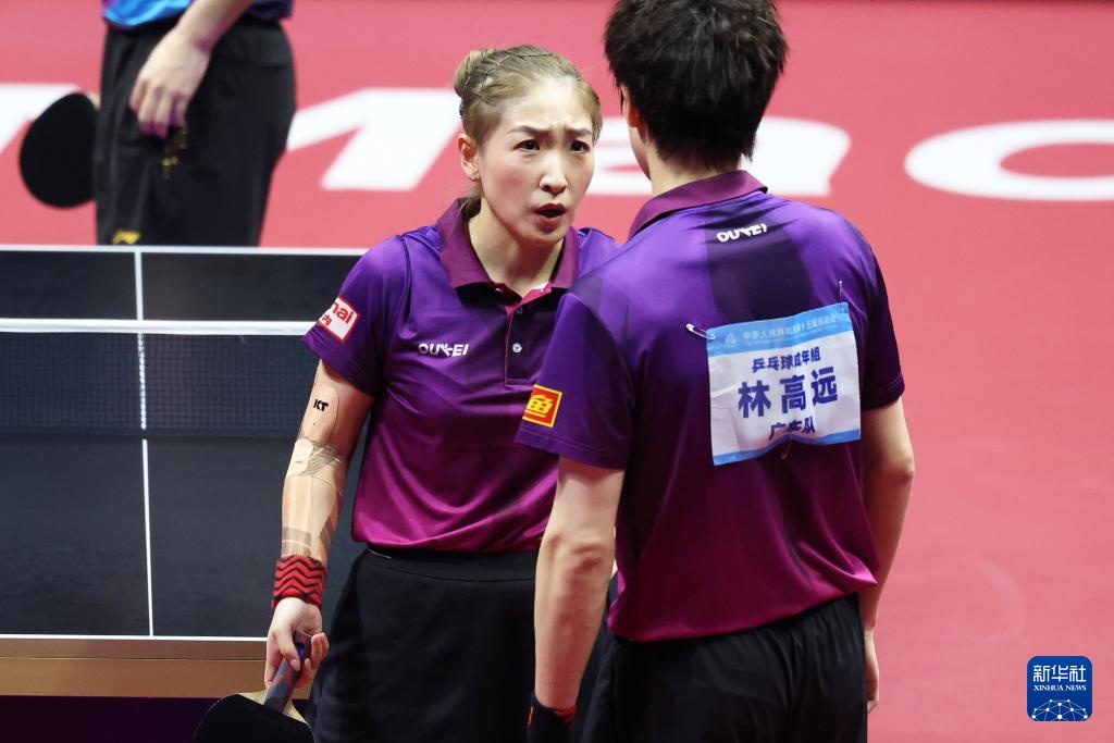 11月14日,廣東隊組合林高遠/劉詩雯(左)在比賽中交流。