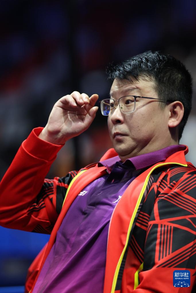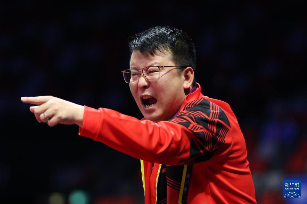 11月14日,獲得冠軍的廣東隊組合林高遠(中)/劉詩雯(右)與教練在頒獎儀式上揮手致意。