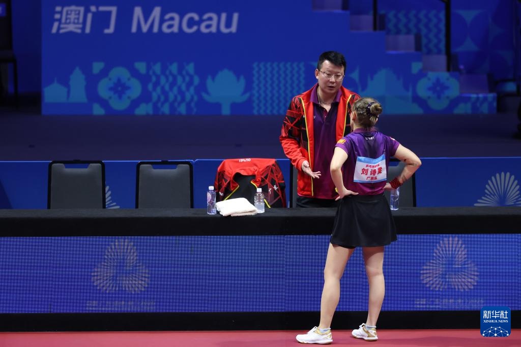 11月14日,廣東隊選手劉詩雯(右)在比賽間隙與教練張超交流。