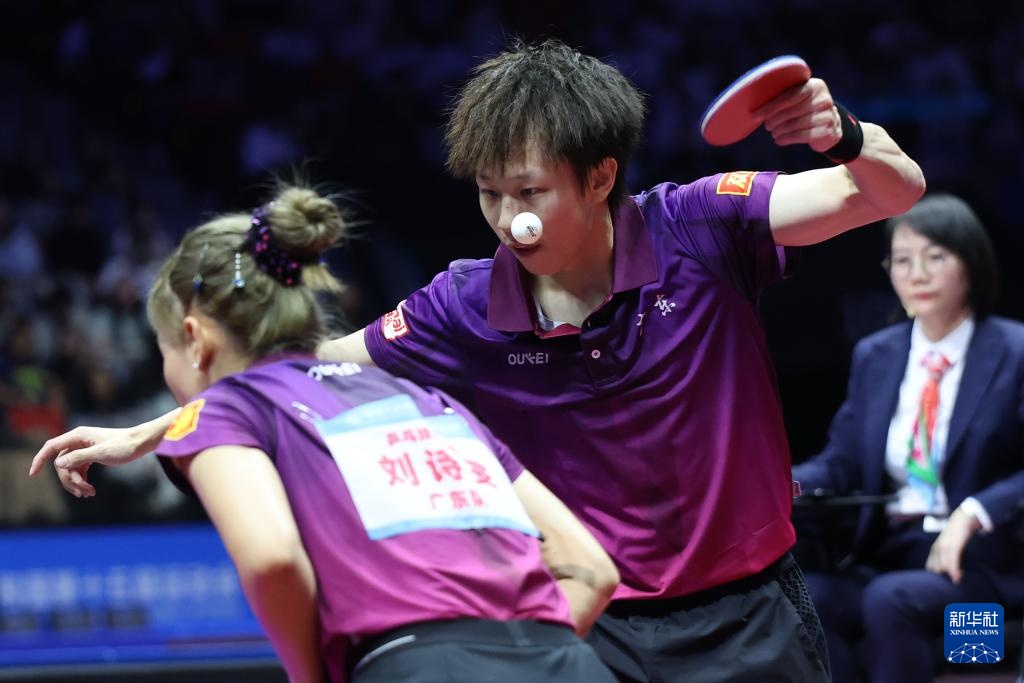 11月14日,廣東隊組合林高遠(左)/劉詩雯在比賽中回球。