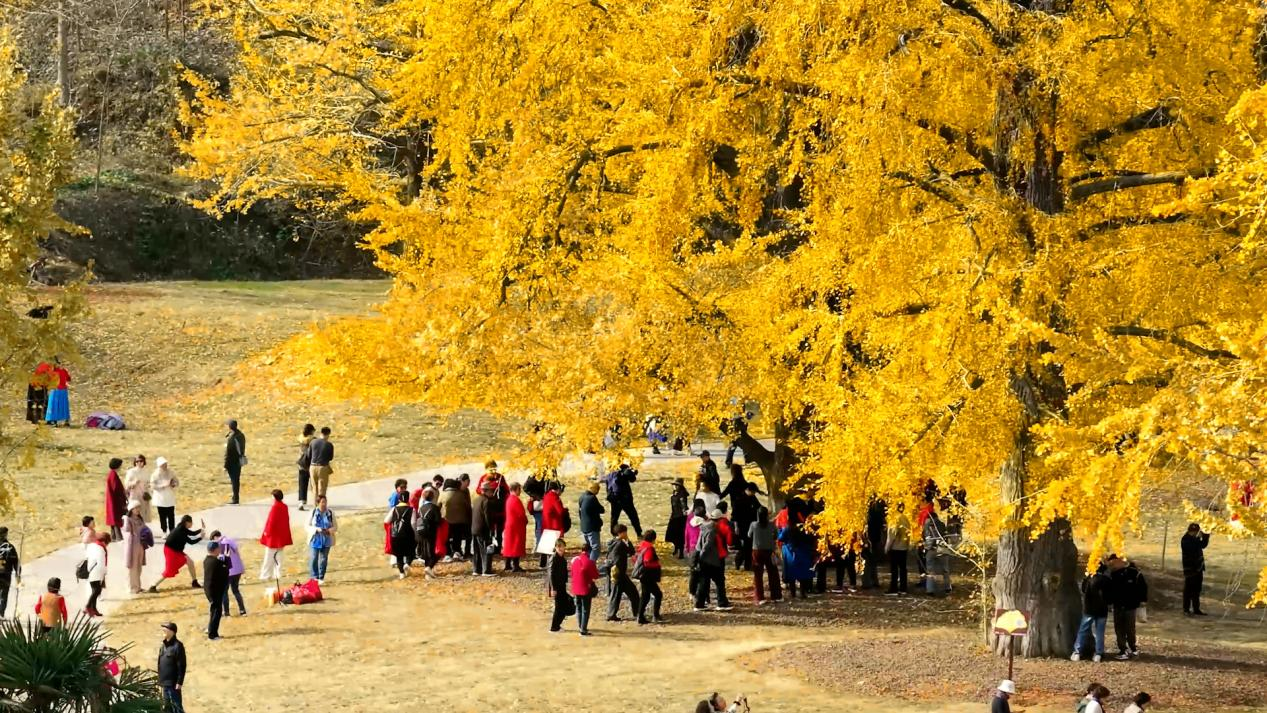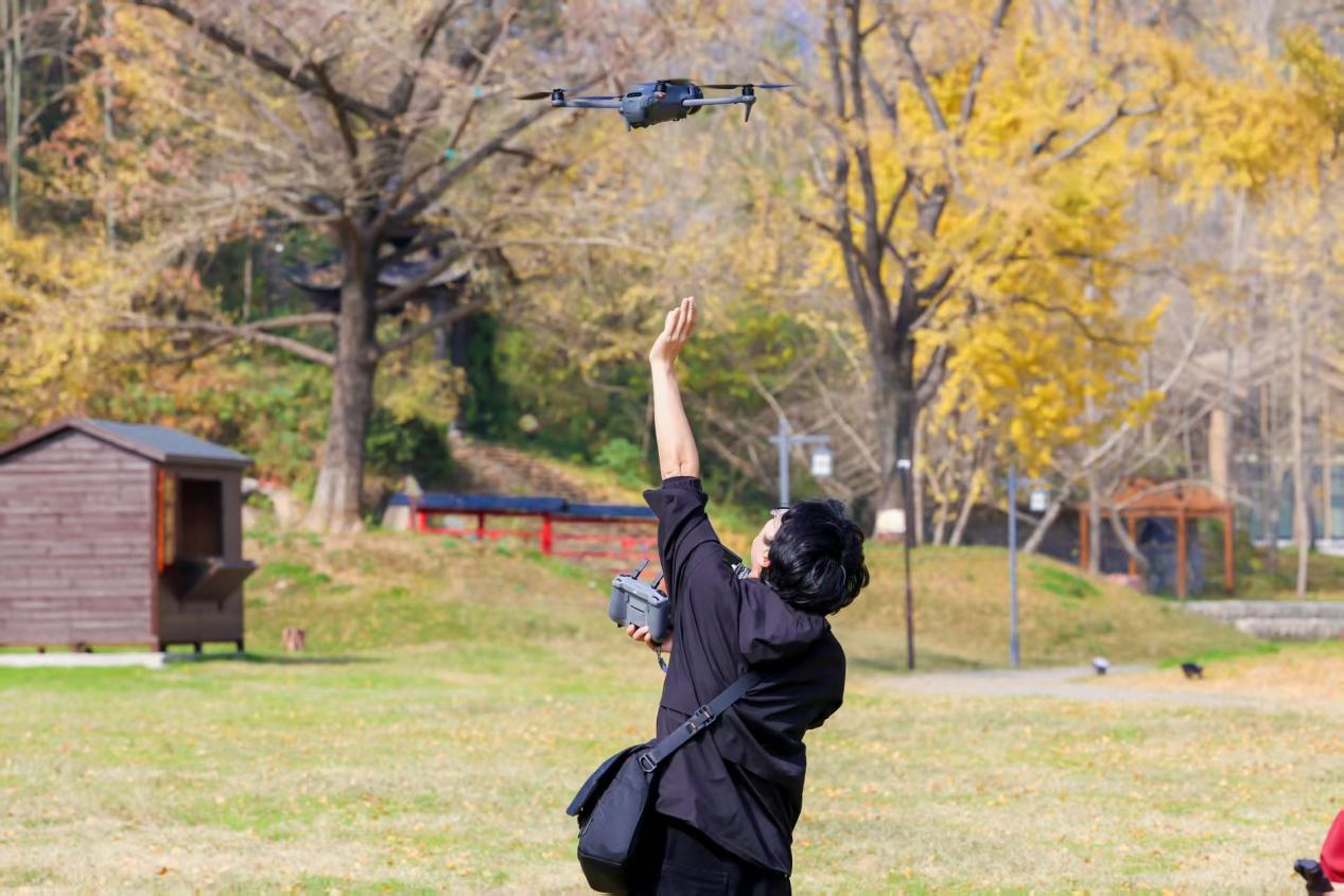 大V們更是被眼前的盛景震撼,紛紛將無人機升向高空。隨著無人機緩緩升空,千年古樹與蜿蜒步道相映成趣,構成一幅絕美的秋日畫卷。大V們專注操控著設備,時而低空掠過枝頭捕捉葉片細節,時而拉高視角記錄全景壯闊,連午飯都顧不上吃,直呼“美到廢寢忘食,每一個鏡頭都不想浪費”。