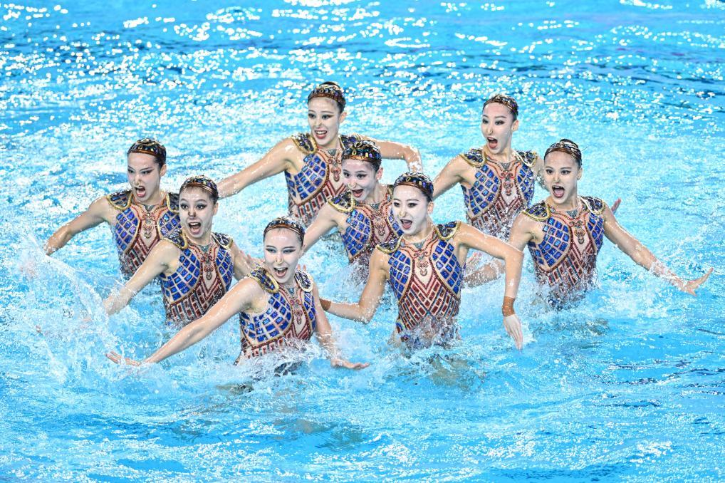11月14日,北京體育大學隊選手在花樣游泳集體技巧自選比賽中。新華社記者 陳鐘昊 攝
