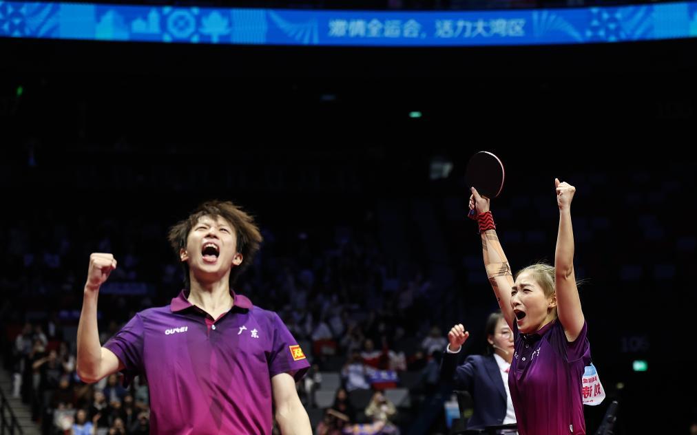 11月14日,廣東隊組合林高遠(左)/劉詩雯慶祝奪冠。新華社記者 孫凡越 攝