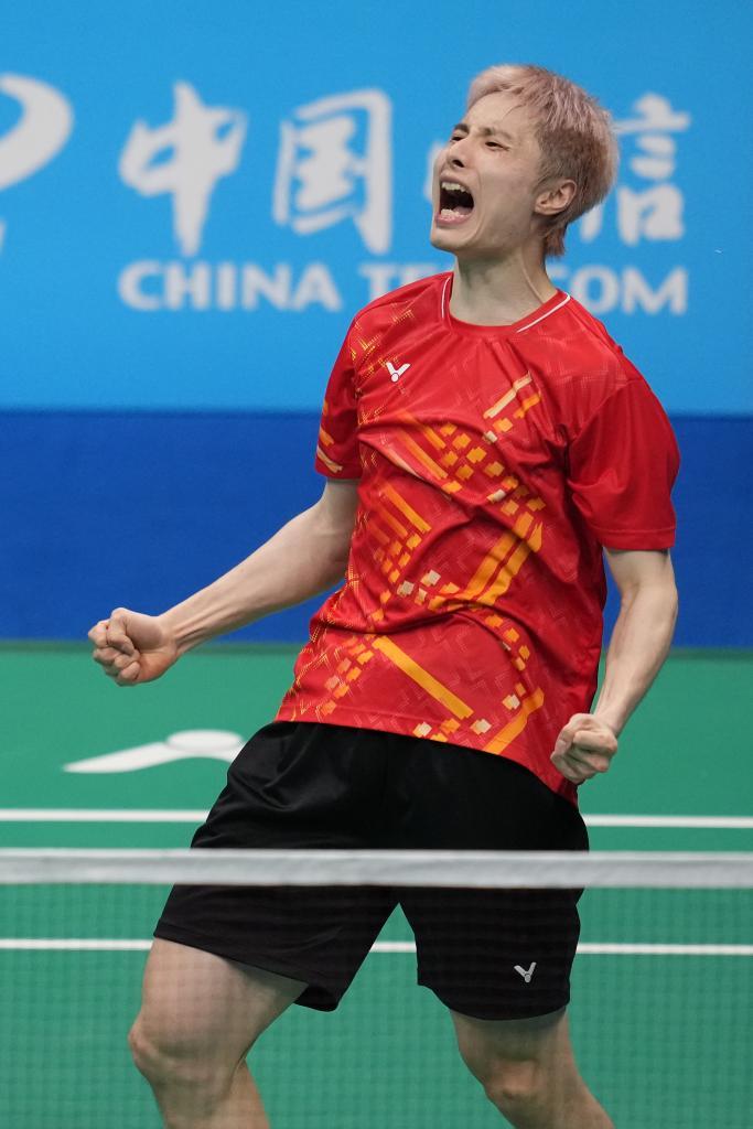 11月14日,江蘇隊選手石宇奇在男單比賽獲勝后慶祝。新華社記者 陳思汗 攝