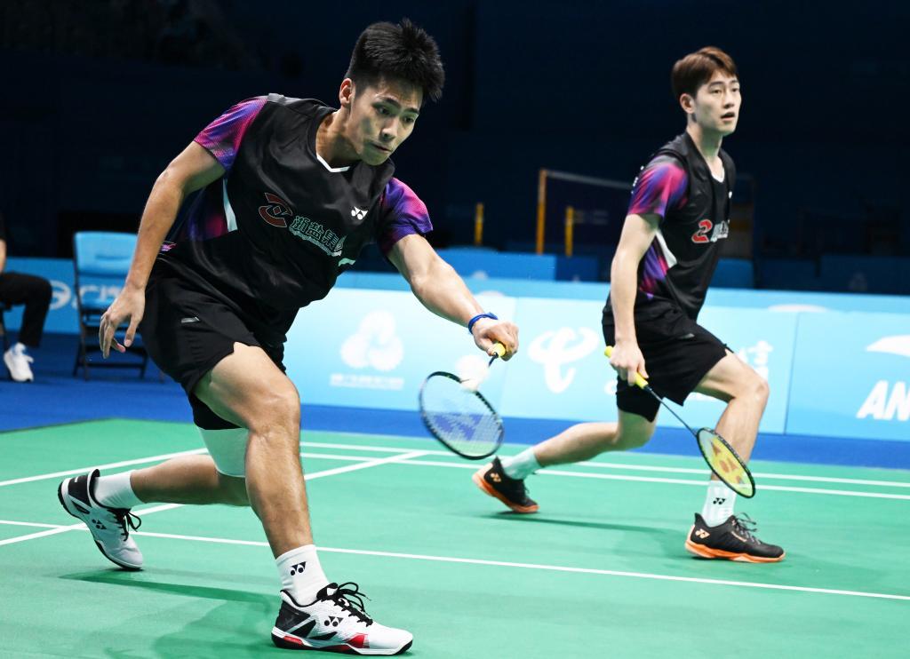 11月14日,浙江隊組合王昶/謝浩南(左)在男雙比賽中。新華社記者 李紫恒 攝