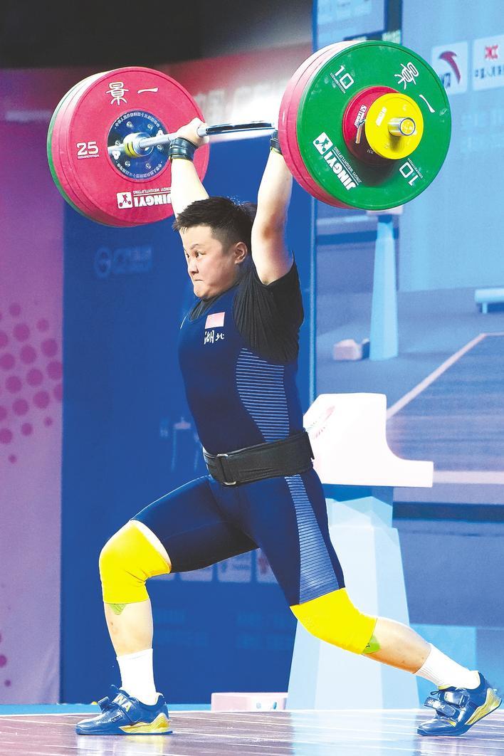 老將汪周雨在挺舉比賽中。 (新華社發)