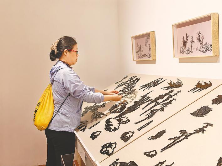 展覽現場還有一件特殊的互動裝置,名為《山水譜》。藝術家李邦耀將中國畫的經典圖式解構,把其中的山、石、樹等基本元素轉化為上百個獨立的金屬部件,觀眾可以在磁性展臺上自由調度這些“模塊”,構建屬于自己的山水圖景,大大增加了普通民眾對于水墨藝術的創作興趣,建立起水墨藝術與普通公眾的文化共鳴。