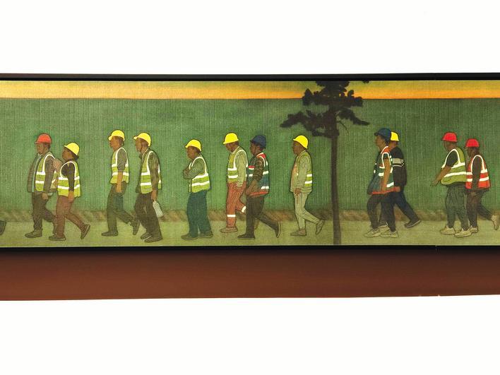 水墨與時代的接軌,也體現在藝術家以水墨藝術為載體,對人們現實生活進行書寫和表達。在武漢美術館(漢口館)的2號展廳里,一幅長達8.6米的絹本工筆畫占據了一整面展墻,令人矚目。這幅畫的作者是中國藝術研究院的國畫院副院長李傳真,她是一名湖北籍畫家,專注于以農民工為題材的現實主義工筆人物畫創作。這幅名為《晨昏線No.2》的作品就用傳統工筆畫法描繪了工人們在天光未明之時的混沌狀態。