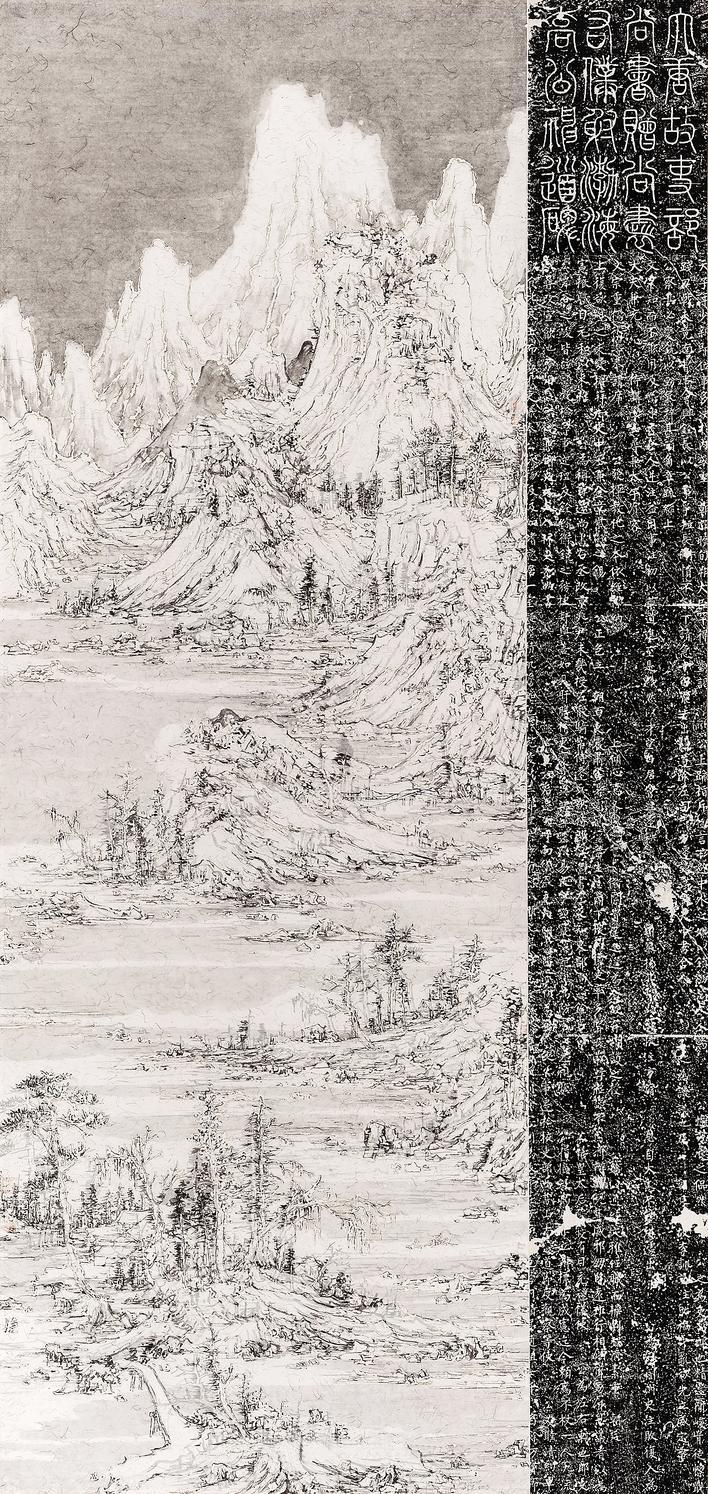 復旦大學教授王天德于2019年創作的《佘山抱水圖》更是把水墨創作玩出了花樣。這件在武漢美術館(漢口館)展出的作品右側植入了清代拓片柳公權《高元裕碑》,用香燙的形式將山水與宣紙層層疊加,第一層畫在畫好后用香燙出痕跡,第二層畫則透過香燙的孔洞展現出來,最后呈現出的是兩層疊加的畫面。山水圖式與古代碑拓、墨跡相置,既反映了中國傳統的審美特征,又產生了不同于傳統的新鮮表達。