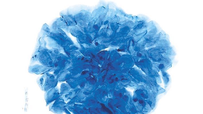 堅守傳統的同時必須與時代審美接軌,這是湖北美術學院原院長徐勇民對水墨藝術的看法。在“時代·筆墨”展的現場,徐勇民向記者介紹了他的水墨作品《湛湛露斯》。這幅作品創作于2016年,題名取自《詩經》中的原句,是他的“大藍花”系列作品之一。“所謂‘一花一世界’,看到這幅作品,能從微觀的形態當中感受到更多世界跟宇宙的變化,我覺得這是中國文化給予我的一種啟示。”