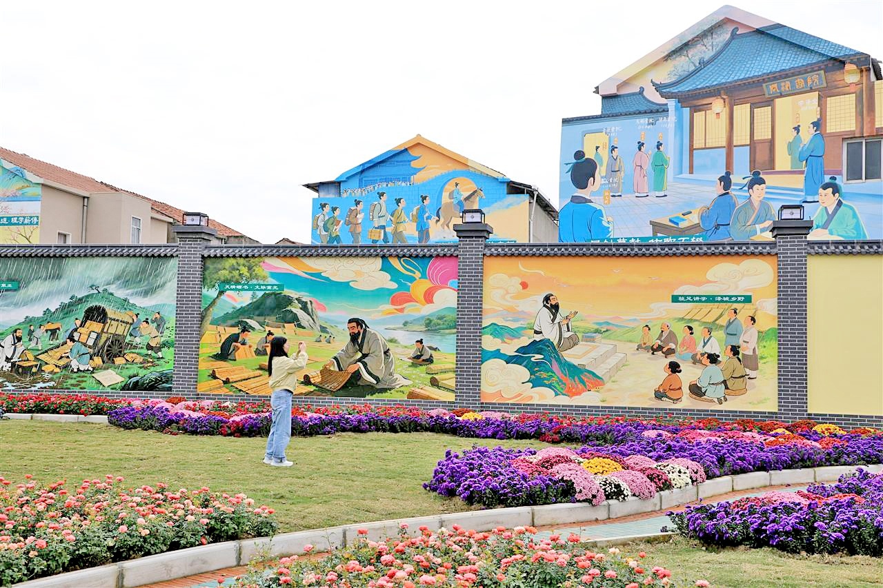極目新聞記者現場看到,墻面采用油畫與墻繪手法,再現了問津書院昔年風貌,“子路問津”“兩小兒辯日”“不恥下問”等孔子傳道經典場景栩栩如生,與路邊盛開的三角梅、月季、桂花等花卉交相輝映,營造出濃郁的書香氛圍與自然意趣。