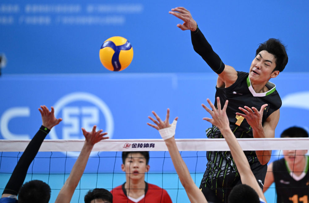 11月14日,山東隊球員胡翰林(前右一)在比賽中扣球。新華社記者 周牧 攝