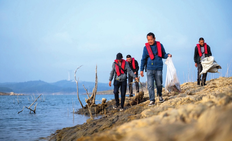 清漂隊員在南水北調中線工程的水源地丹江口庫區小島上清理垃圾(2024年10月28日攝)伍志尊攝/本刊