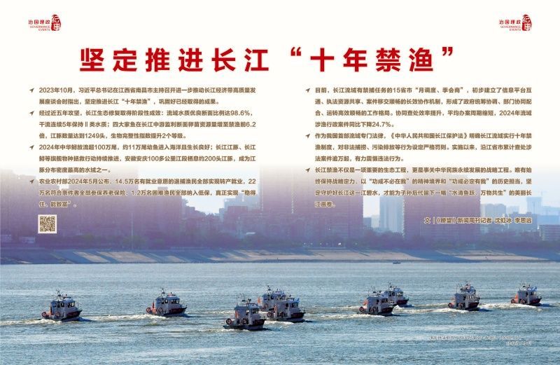 2021年1月1日全面啟動至今,長江“十年禁漁”進程近半,初步形成四個方面的實踐經驗:法治為基,以長江保護法為統領,構建全域覆蓋的法治框架;科技賦能,天空地一體化監管網絡覆蓋重點水域,非法捕撈案件發生率較禁漁前大幅下降;以民為本,14.5萬名轉產漁民實現“護水”與“富水”雙贏,人均收入顯著增長;凝聚合力,建立有禁捕任務的15個省市“月調度、季會商”機制,加強協同聯動,破解“九龍治水”難題。