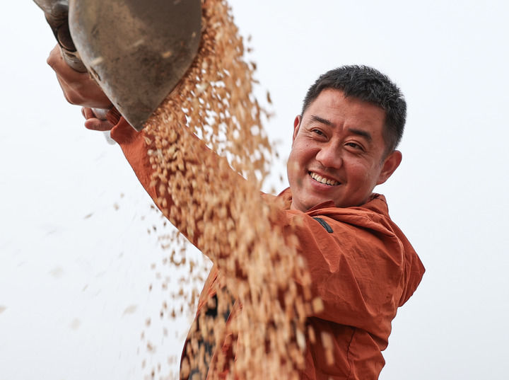 2025年5月27日,江蘇省淮安市盱眙縣種糧大戶(hù)劉凱在田間查看收獲的小麥。這批小麥選用淮安市農(nóng)科院選育的良種“淮麥60”。新華社發(fā)(許昌銀攝)