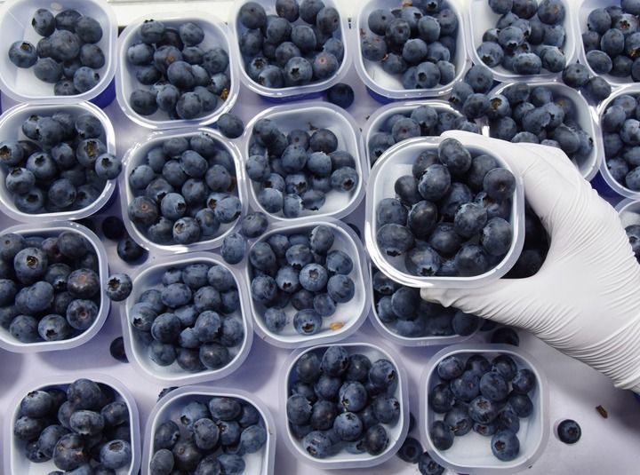 2025年2月28日,農(nóng)戶(hù)在云南省紅河哈尼族彝族自治州蒙自市草壩鎮(zhèn)繽紛農(nóng)業(yè)示范基地的冷藏庫(kù)里分揀藍(lán)莓。新華社發(fā)(薛瑩瑩攝)