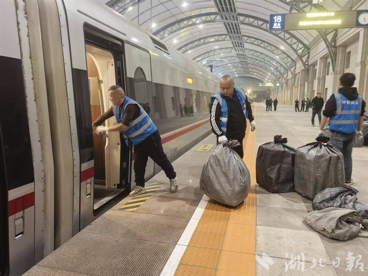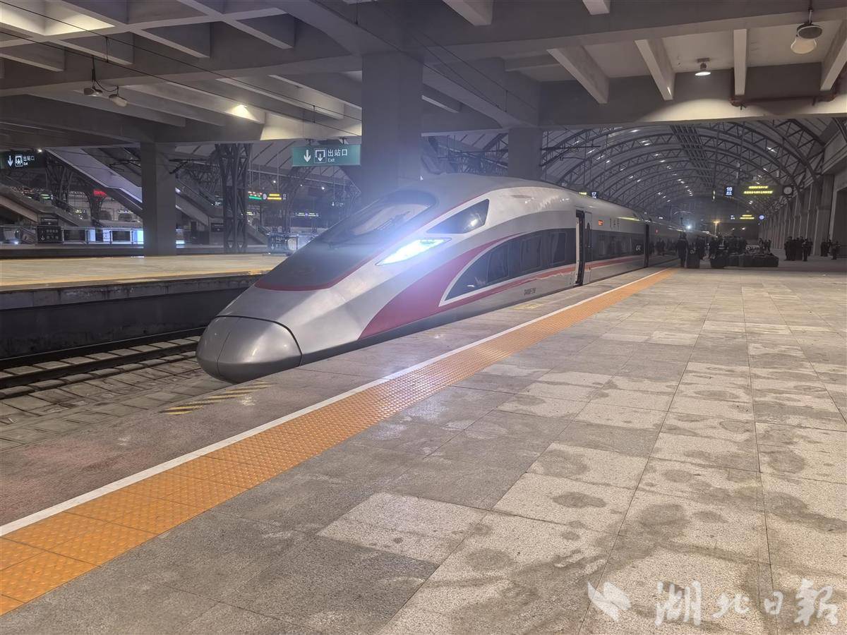 11月15日凌晨5時58分,夜色未褪,DJ892次列車載著10噸重的蜜桔、服裝、電子產品、鮮花等湖北特色產品,從漢口火車站18站臺緩緩駛出,沿京廣高鐵一路南下,將直抵廣州白云站。