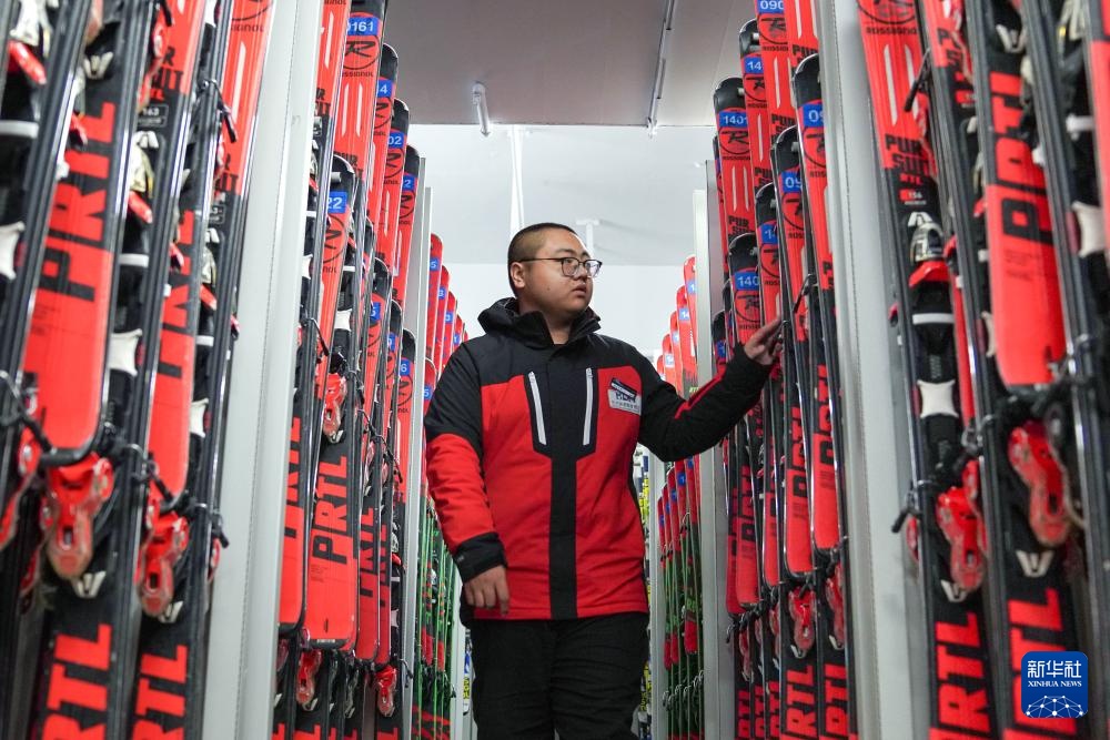 11月14日,在位于吉林市冰雪經濟高質量發展試驗區的北大湖滑雪度假區,工作人員清點用于租賃的雪具。