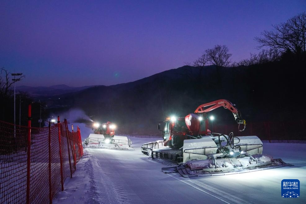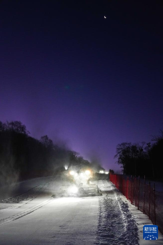 11月14日,在位于吉林市冰雪經濟高質量發展試驗區的北大湖滑雪度假區,壓雪機在雪道上作業。