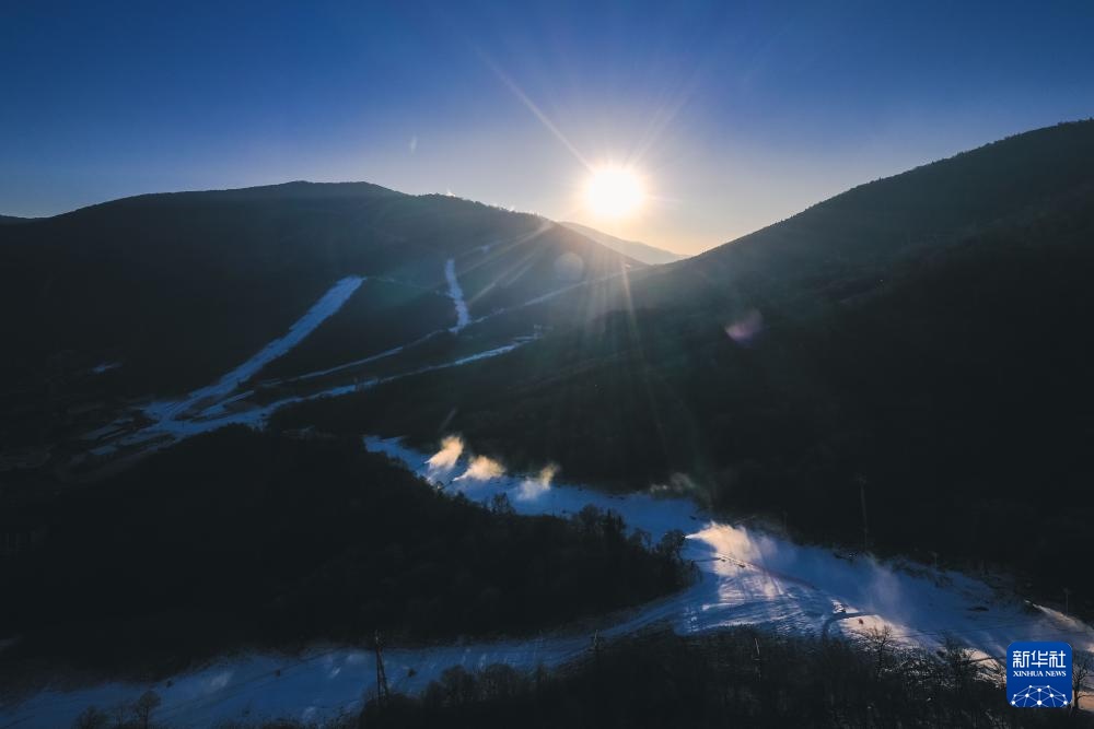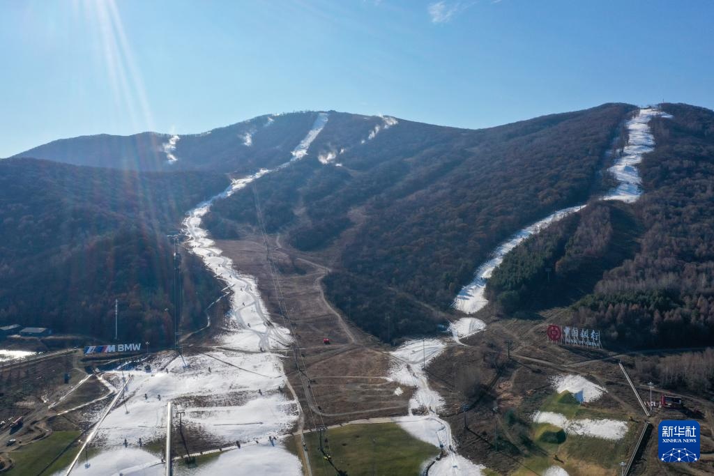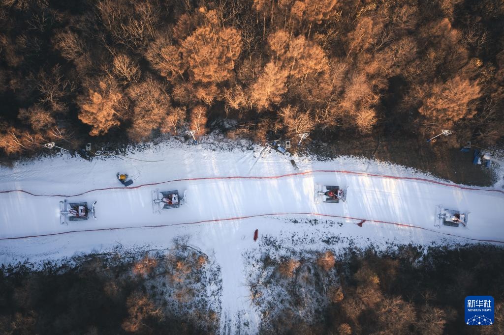11月14日,在位于吉林市冰雪經濟高質量發展試驗區的北大湖滑雪度假區,造雪機進行造雪作業(無人機照片)。