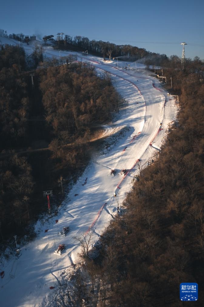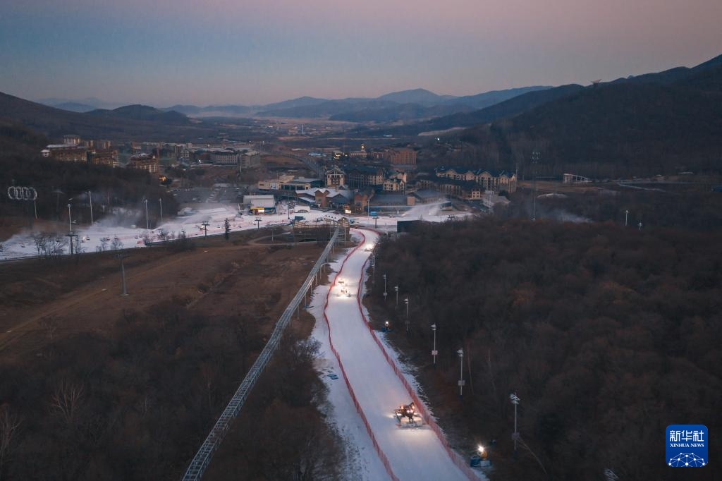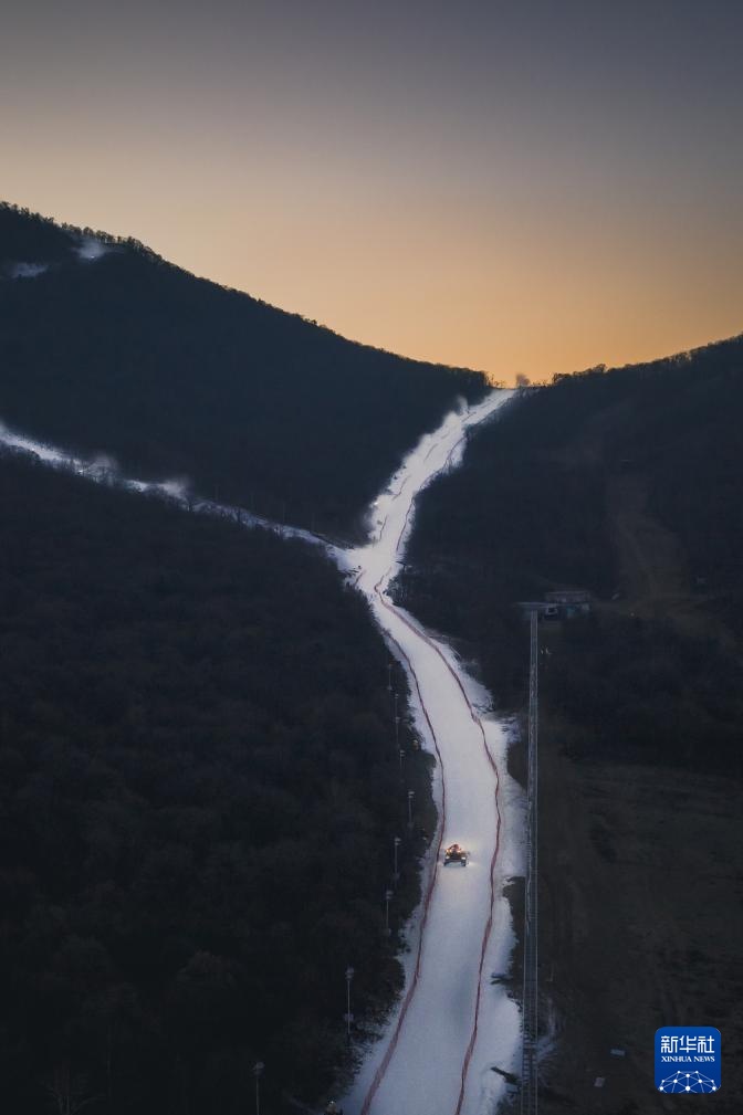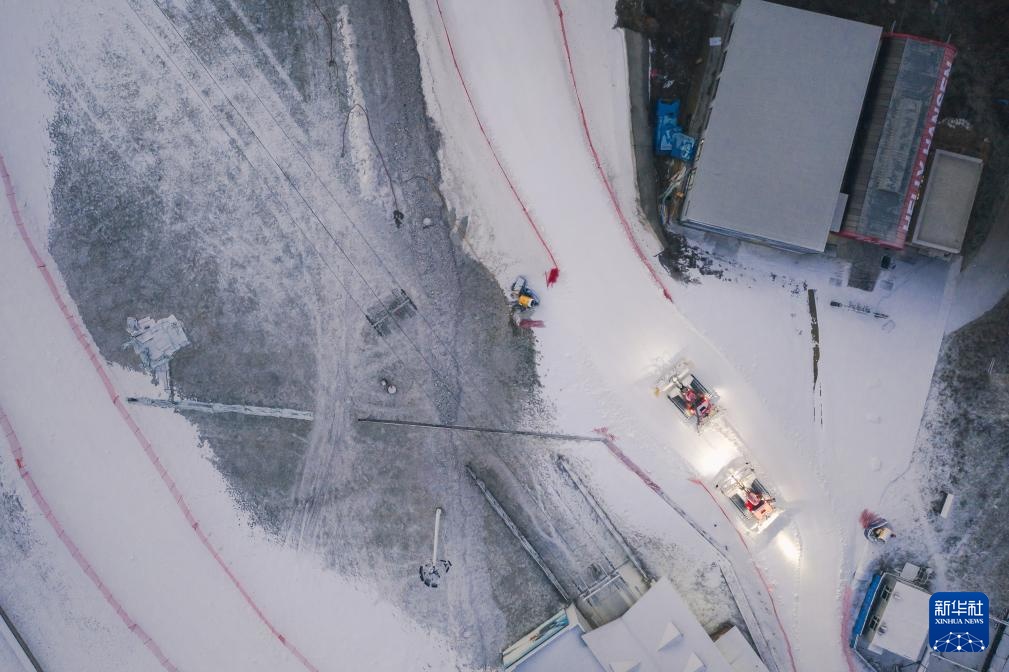 11月14日,在位于吉林市冰雪經濟高質量發展試驗區的北大湖滑雪度假區,壓雪機在雪道上作業(無人機照片)。
