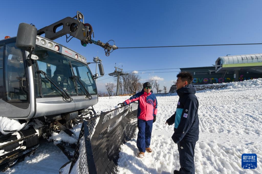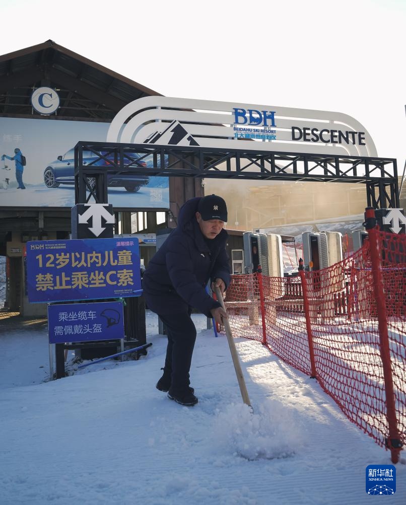11月14日,在位于吉林市冰雪經濟高質量發展試驗區的北大湖滑雪度假區,工作人員平整纜車站閘機附近的雪面。