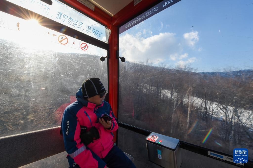 11月13日,在位于吉林省吉林市的松花湖度假區雪場,負責人吳濤乘纜車檢查造雪情況。