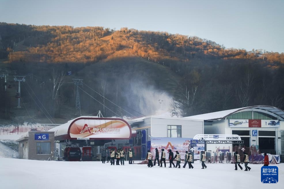 11月14日,在位于吉林市冰雪經濟高質量發展試驗區的北大湖滑雪度假區,工作人員集結準備進行雪道巡檢。