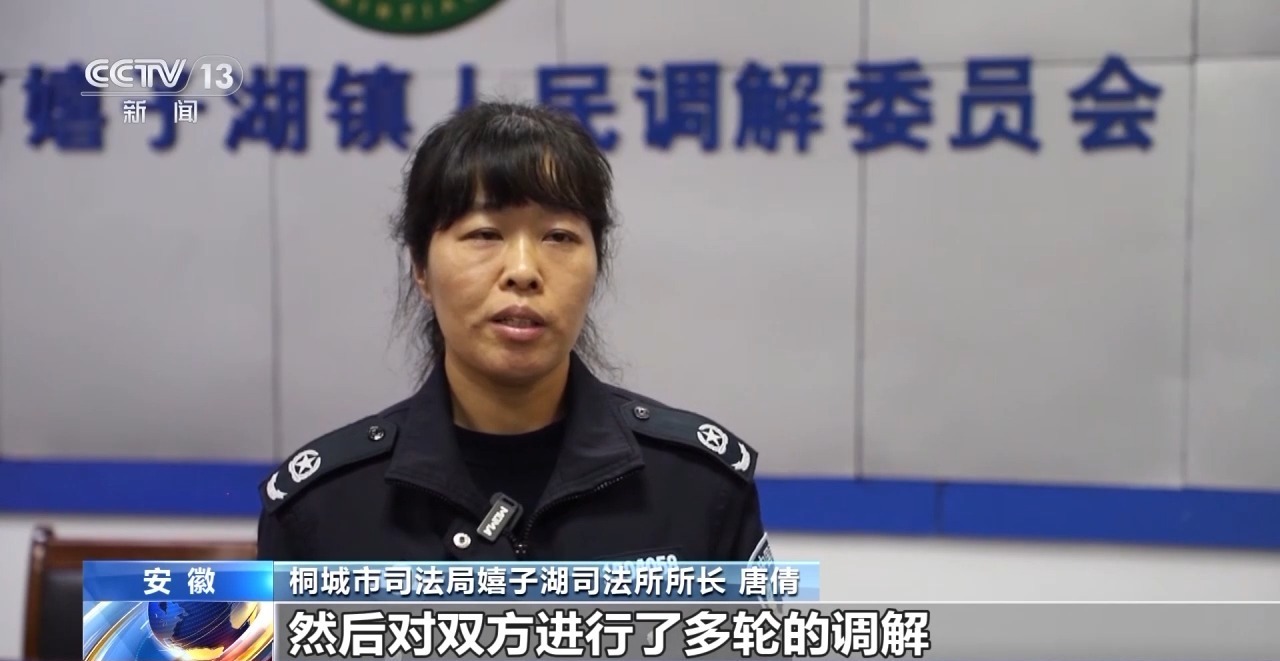 桐城市司法局嬉子湖司法所所長 唐倩:我們運用“六尺巷工作法”,“聽、辨、勸、借、讓、和”六步規程,對雙方進行多輪調解。