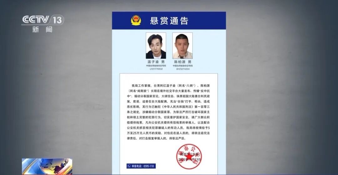 近日,福建省泉州市公安局發布懸賞通告,公開征集臺灣網紅溫子渝(網名“八炯”)、陳柏源(網名“閩南狼”)涉嫌煽動分裂國家的違法犯罪線索。
