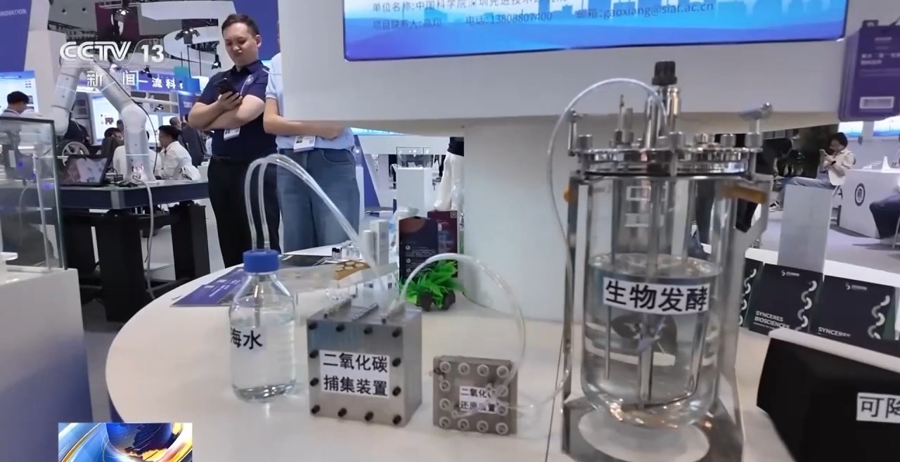 中國科學院深圳先進技術研究院博士生 郭明明:我們用電催化的一種裝置,把海水中的二氧化碳先提取出來,再用二氧化碳還原裝置,把捕獲的二氧化碳還原成甲酸。生物細菌把甲酸吃進去之后,可以吐出來一種新的東西,得到可降解塑料的原料,就是丁二酸和丁二醇,再通過壓制的工藝,就可以得到這種可降解的吸管,還有塑料瓶。