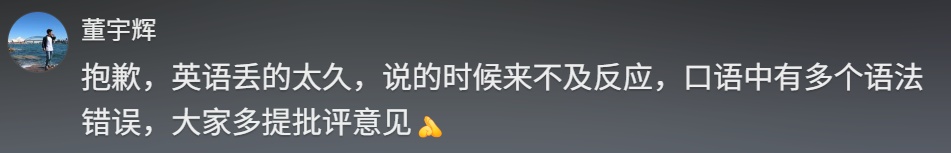 11月8日,董宇輝在賬號“與輝同行”評論區表示,“抱歉,英語丟得太久,說的時候來不及反應,口語中有多個語法錯誤,大家多提批評意見。”