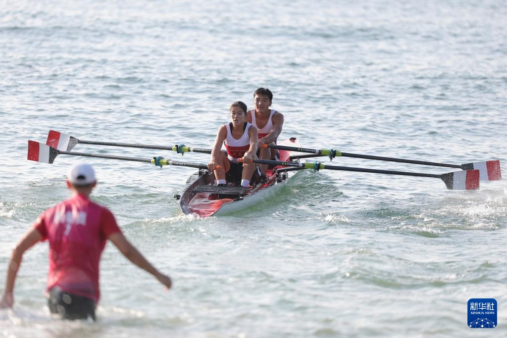 11月15日,廣東隊選手王云飛(右)和張桂萍(中)在混合雙人雙槳計時賽中。