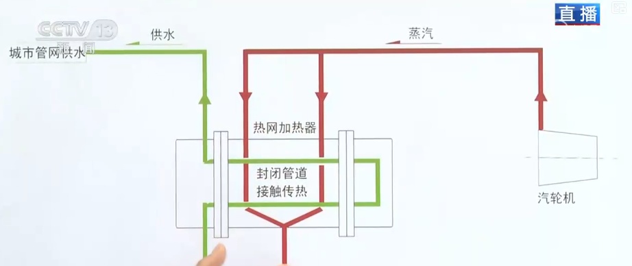 這熱能是怎么傳遞的?圖中紅色部分代表的是高溫蒸汽,而綠色部分則是城市供熱管網(wǎng)中的熱水。高壓的蒸汽和城市供熱水管不直接接觸,是通過中間的熱網(wǎng)加熱器間接傳熱,也就是通過換熱站把高溫蒸汽的熱量傳遞給家中的暖氣管,也保證了居民供暖的安全。