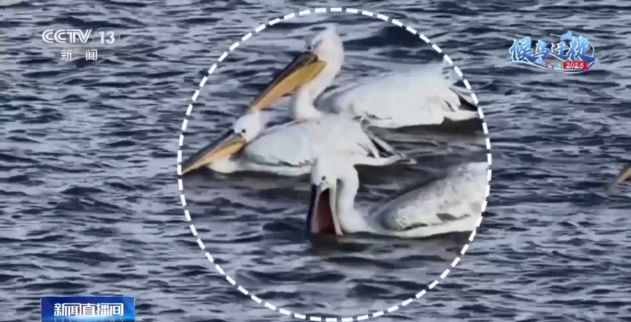 生態(tài)攝影師 李東明:我們開玩笑地叫“大嘴吃天下”。它集體覓食的時候,嘴巴全在水里,像網(wǎng)兜一樣,它一口氣最少能吞一兩公斤肯定沒問題,所以這個鳥的特點就是大,能吃。這兩天已經(jīng)達到了53只。