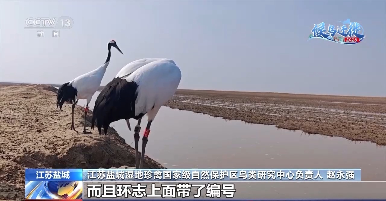 江蘇鹽城濕地珍禽國家級自然保護區(qū)鳥類研究中心負(fù)責(zé)人 趙永強:給它裝了環(huán)志,而且我們是佩戴了紅色的叫旗標(biāo),紅色的旗標(biāo)因為放到野外去之后很醒目,我們可以很容易發(fā)現(xiàn)腿上的環(huán)志,而且環(huán)志上面帶了編號,例如說YC,鹽城開頭。另一個腿上是裝的一個叫衛(wèi)星跟蹤器,它的供電是通過太陽能,可以進行不間斷地進行后續(xù)的跟蹤。