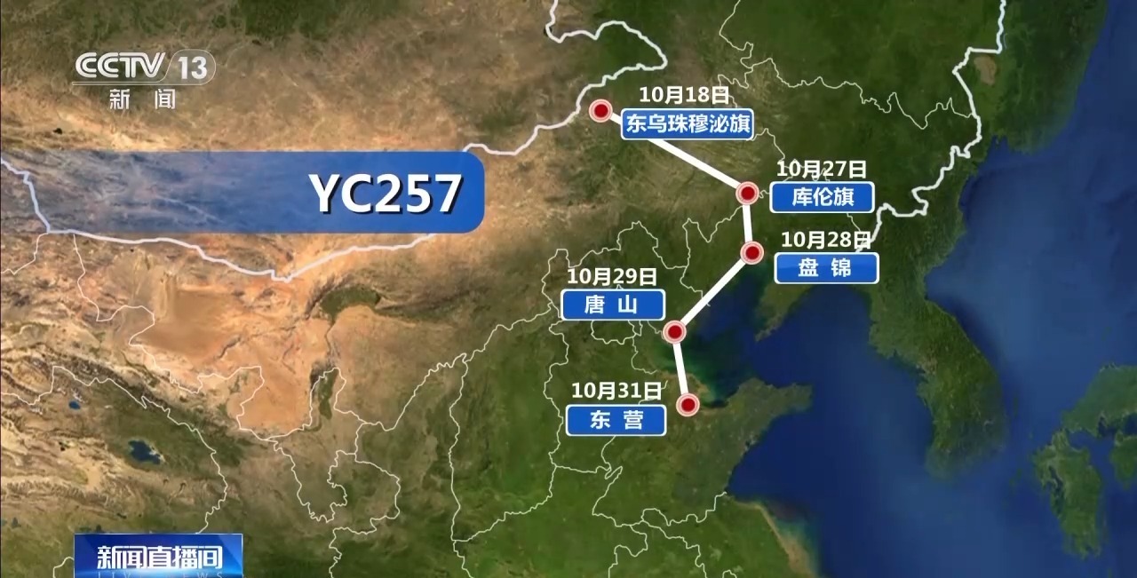 10月18日,YC257于開始從內(nèi)蒙古錫林郭勒盟東烏珠穆沁旗出發(fā)南下,遷徙了100公里后進行短暫休息。 10月26日繼續(xù)南下,10月27日到達內(nèi)蒙古自治區(qū)通遼市庫倫旗庫倫鎮(zhèn)。 10月28日到達遼寧盤錦。 10月29日到達河北省唐山市。 2天后,它繼續(xù)飛行,于10月31日到達山東東營,目前在東營已停留14天。