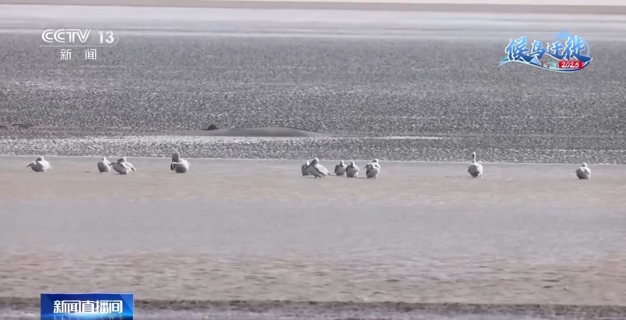 在江蘇鹽城的另一處濕地條子泥濕地,卷羽鵜鶘如約而至。這些鳥中“大個子”在一群候鳥中格外突出。