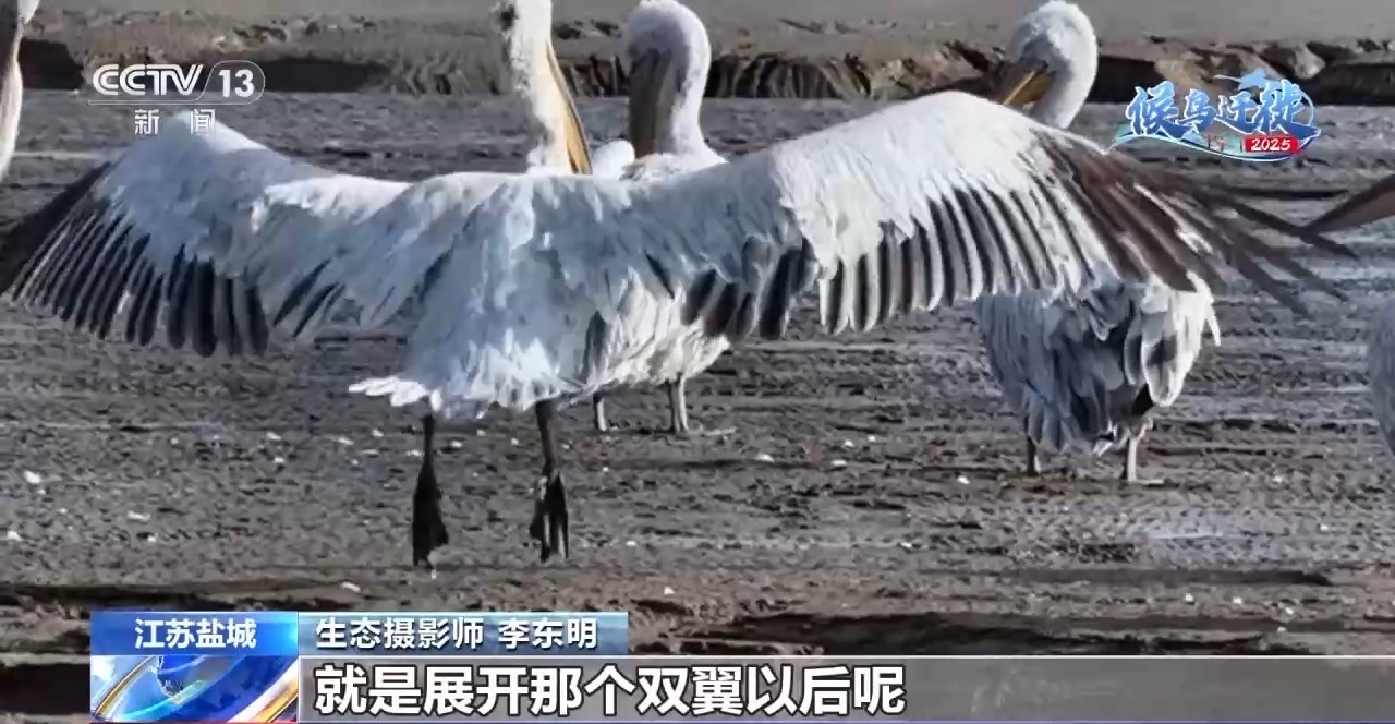 生態(tài)攝影師 李東明:我們在條子泥濕地記錄到卷羽鵜鶘的種群數(shù)最高紀(jì)錄是93只,卷羽鵜鶘最大的特點是展開雙翼能達到三米到三米五左右,而且它是一個很龐大的鳥種。