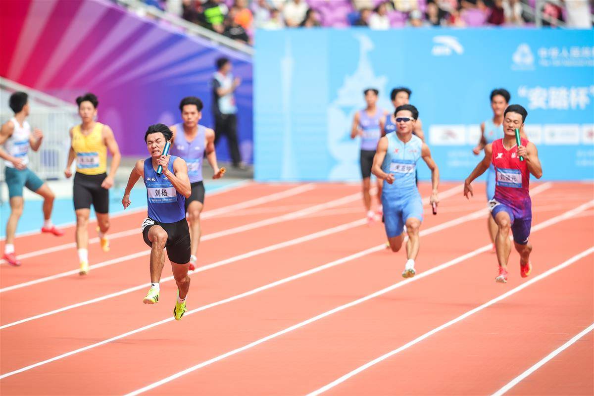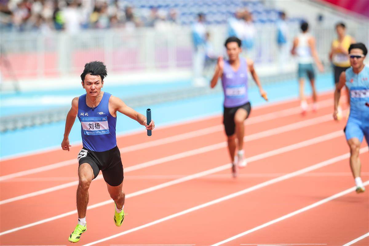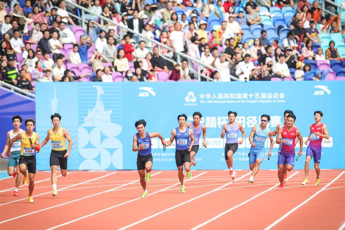 11月15日,廣東奧體中心體育場,十五運田徑項目開賽日,在4x100米混合接力預賽中,湖北隊跑出41秒02的組合最佳,以預賽小組第三、總成績排名第六的成績晉級晚間決賽。(湖北日報全媒記者 時龔 攝)