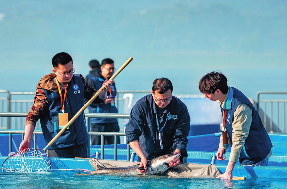 湖北省宜昌市長江珍稀魚類放流點開展中華鱘保護宣傳和增殖放流活動。圖為工作人員將中華鱘撈至放流箱內(2024年3月28日攝)伍志尊攝/本刊