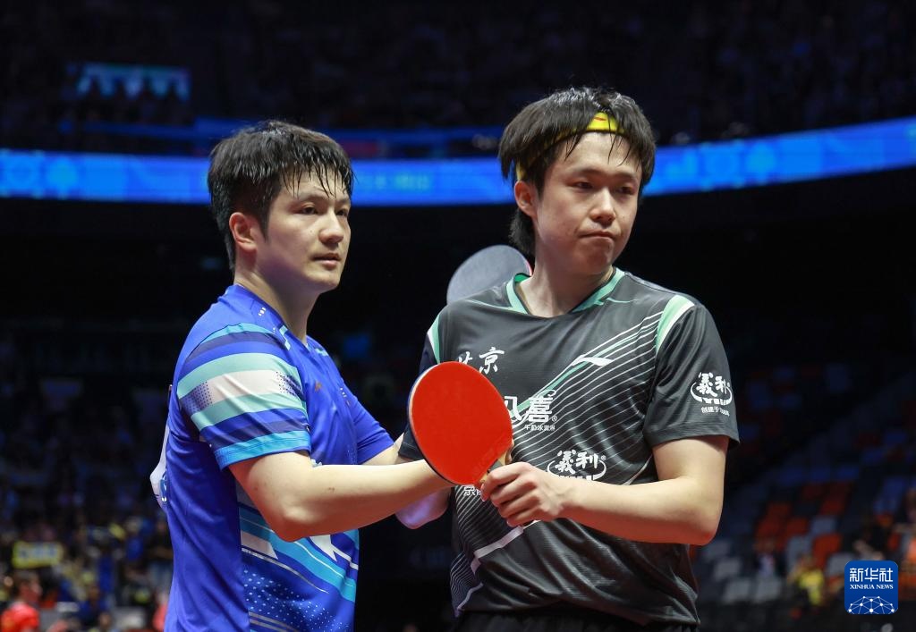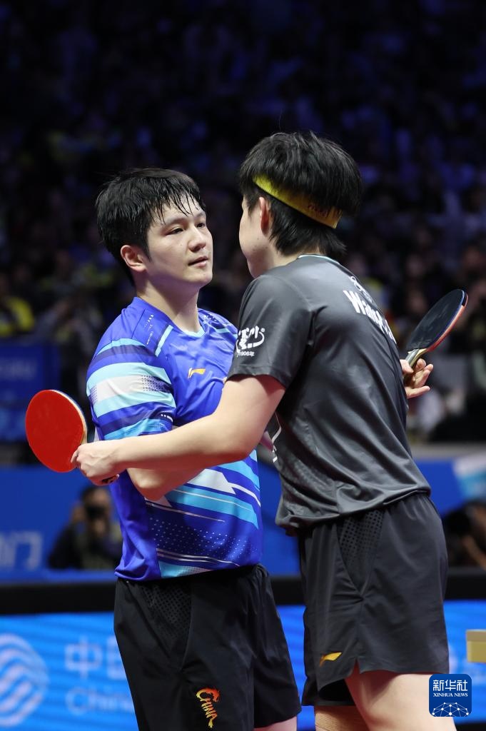 11月15日,樊振東(左)和王楚欽在比賽后致意。