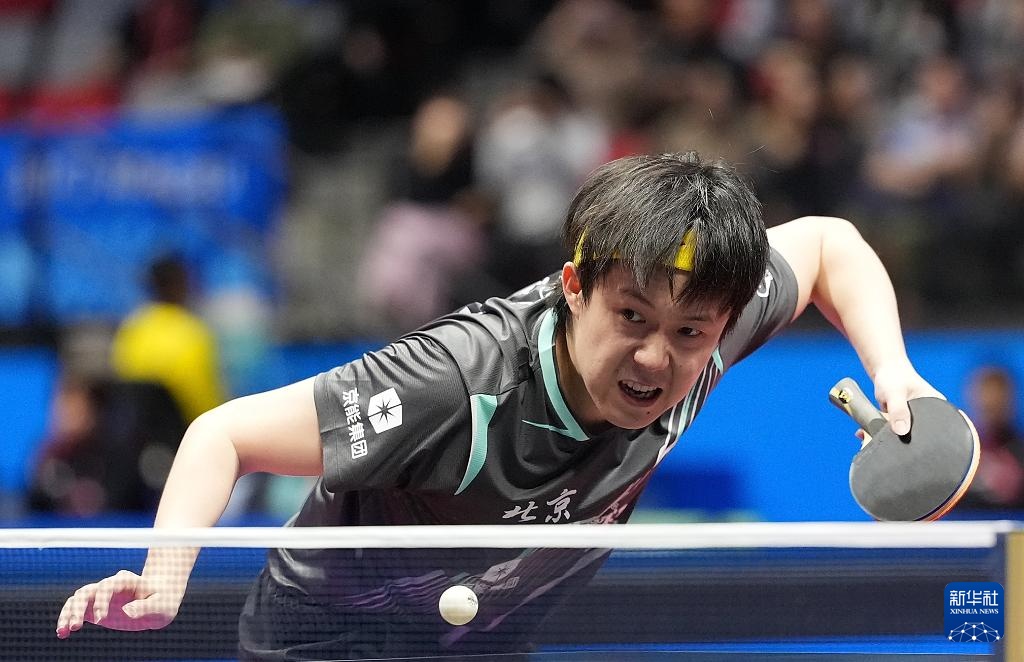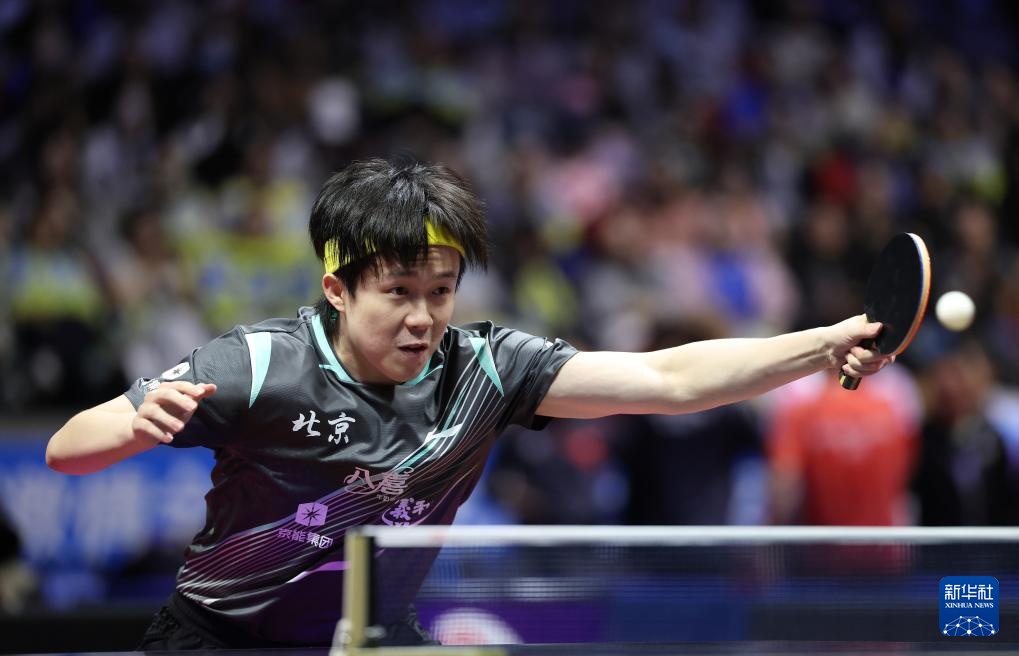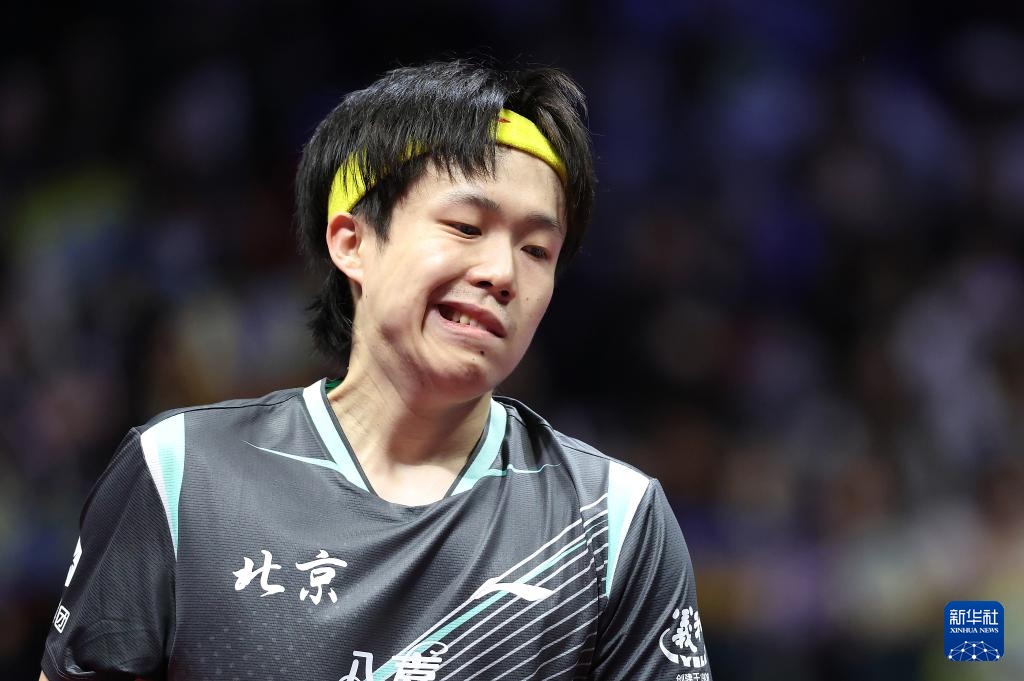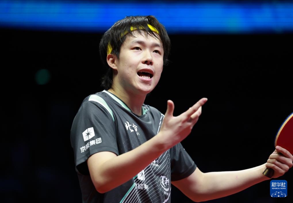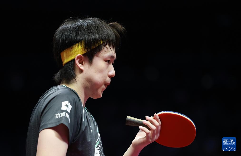 11月15日,王楚欽在比賽中拿起他的球拍。