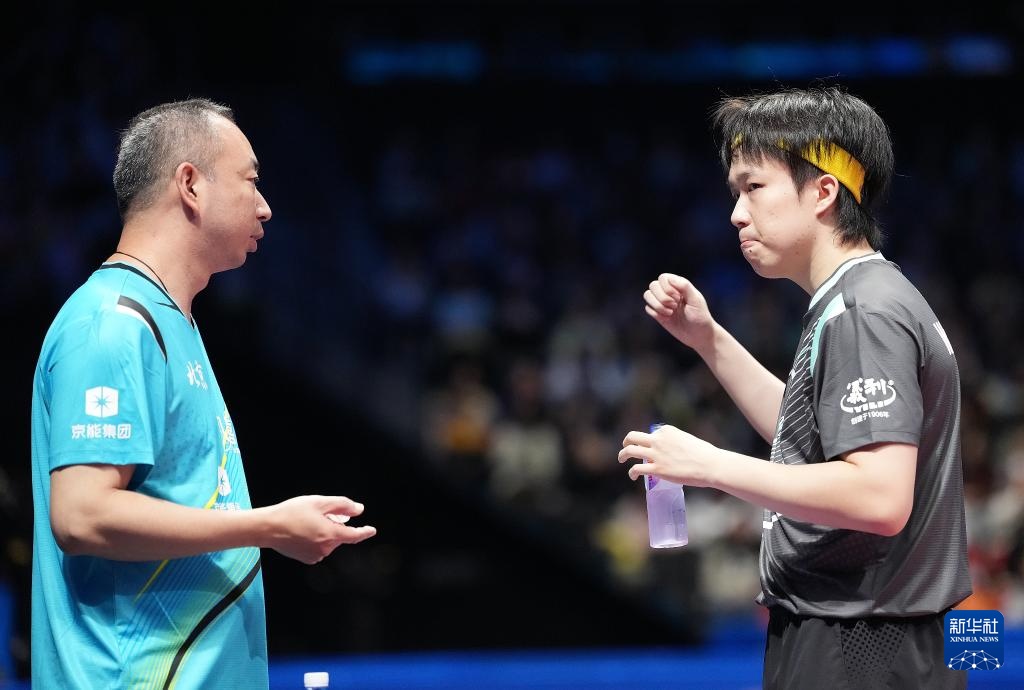 11月15日,王楚欽(右)在比賽暫停階段與教練交流。