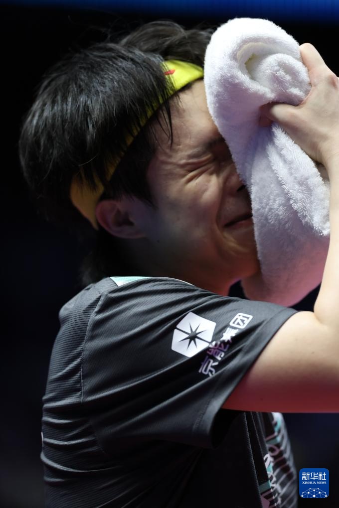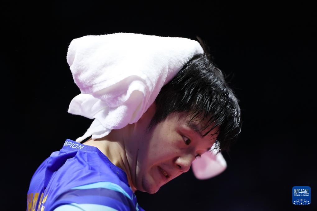 11月15日,王楚欽在比賽暫停階段擦汗。
