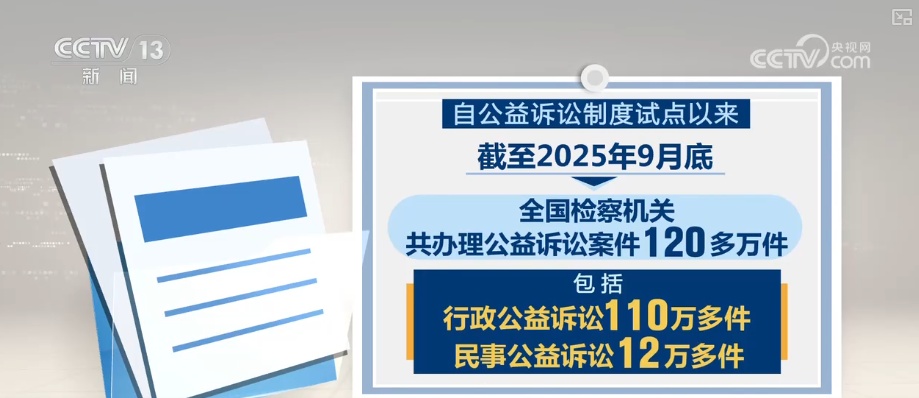 自公益訴訟制度試點以來,截至2025年9月底,全國檢察機關共辦理公益訴訟案件120多萬件,包括行政公益訴訟110萬多件、民事公益訴訟12萬多件。辦案領域涵蓋生態環境和資源保護、食品藥品安全、安全生產、反電信網絡詐騙等14個領域。
